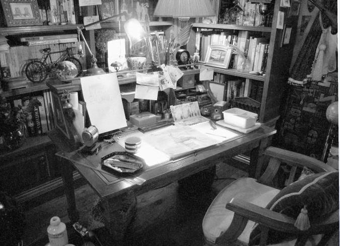 «Рабочий стол» Хаяо Миядзаки в музее «Гибли»; предполагалось, что за ним он будет на самом деле работать раз в неделю. Ему пришлось отказаться от этого плана, так как толпы людей, собравшиеся, чтобы наблюдать за режиссером, мешали другим посетителям музея.