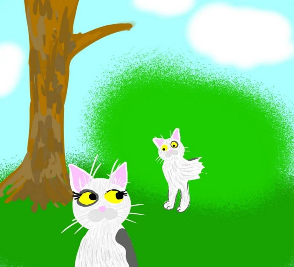 И тут из кустов вышла кошка белого с тёмными пятнами цвета, а за ней ещё один кот.