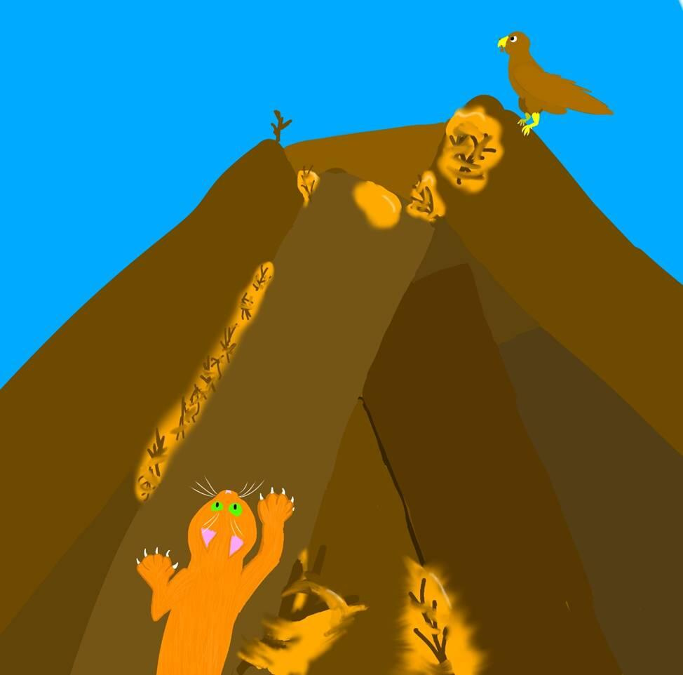 Однажды Келли спала в домике, но вдруг кошка услышала странный шум. Он шёл откуда-то сверху. Келли посмотрела на крышу домика и увидела там небольшого орла. Он сидел на крыше и вытаскивал из неё ветки. С каждой вытащенной веткой крыша становилась всё более хлипкой, потому что эти ветки играли очень важную роль они были перемазаны смолой и служили перекрытиями для крыши.