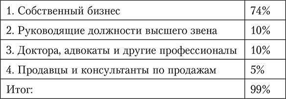 Основная масса миллионеров состоит из профессионалов: врачей, стоматологов, юристов, архитекторов, инженеров и других лиц с высшим образованием, которые могут брать высокую плату за свои услуги. Эти люди получают ученые степени, посвящают себя тому, чтобы стать лучшими в своем деле, поднимаются на вершину профессиональной области, имеют высокие доходы, а затем сохраняют деньги. 10 % миллионеров в Соединенных Штатах попадают в эту категорию.