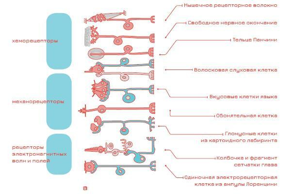 Наружу наш мозг выставил детекторы фотонов, разных химических веществ, датчики давления и т.д. При всём кажущемся многообразии наших ощущений они производятся весьма ограниченным набором физических воздействий (рис. 1а, б).