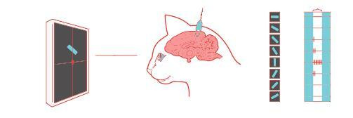Схема классического эксперимента Д. Хьюбела и Т. Визеля (справа на вертикальной диаграмме изображены предъявляемые животному стимулы, слева интенсивность реакции нейронов зрительной коры, в которые был установлен воспринимающий нейронные разряды электрод)