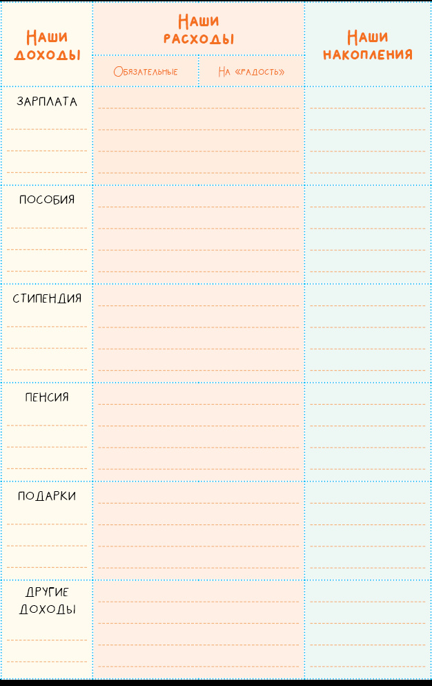 Вы вместе с родителями можете обсудить, из чего складываются доходы вашей семьи. И на что они тратятся (как правило, сначала оплачивается все необходимое, и из того, что осталось, выделяются деньги на накопления и желаемые траты). Конкретные суммы указывать можно, но необязательно. В таком случае в каждой статье расходов указывается процент от общего дохода (например, еда 40 % доходов).