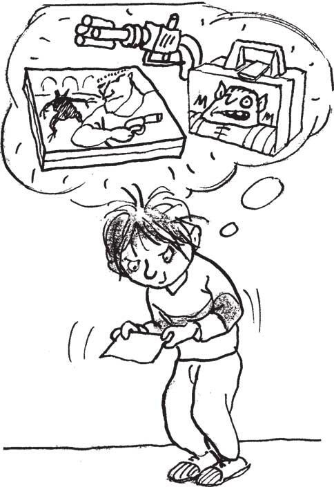 Ужасный Генри потряс маленький тощий свёрток. Что-то подозрительно лёгкий. Даже слишком. Может, в нём деньги? Это было бы просто супер! Ну, конечно, деньги. Что же ещё? Генри уже давно мечтал о контейнере для еды с «Мутантом Максом», бац-бац-шмяк-бластере и особенно о новой игре «Терминаторы-гладиаторы» рекламу с ней постоянно крутили по телику. Мама с папой такие злые и жадные, они ни за что не купят эту игру. Но на свои собственные денежки Генри может купить всё, что захочет! Вот так! ХА-ХА-ХА. Ральф позеленеет от зависти, увидев у Генри контейнер с «Мутантом Максом». И Генри ни за что не разрешит Питеру даже прикасаться к бац-бац-шмяк-бластеру.
