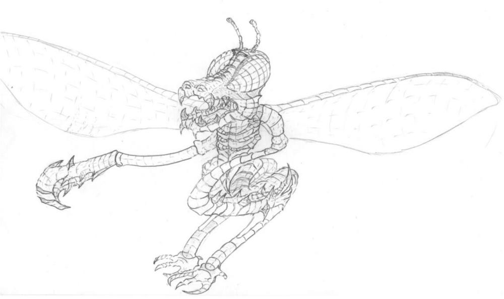 Дальше всё происходило стремительно. Четыре аз-жарца выпорхнули из пролома в породе и моментально угодили в ловушку. С криком «Давай!» Най-Гарк ринулся на первого жарца (Жарцы насекомые небольшого роста, взрослому аянцу были немного выше колена) и ударил его со всего маха ногой. Этот аз-жарец не смог ни сманеврировать, ни защититься, по сути, он не понял даже, что случилось. С невероятным для его комплекции разгоном, он влетел в большой каменный валун справа от трещины и, полностью переломавшись, убился об него. Было слышно, как треснул его карапакс и как насекомое, истекая белой кровью, слегка подергивая конечностями, за миг до того как испустить дух, что-то проскрипело остальным. По сигналу Сай-Дмар спрыгнул с валуна, перемахнув тело первого убитого жарца и потянув сетку, перекрыл тем самым путь к отступлению в трещине в скале. Тогда аз-жарцы, которых явно застали врасплох, попытались улететь. Ни-Нол появился как раз вовремя и ударил ближайшего летевшего на него аз-жарца с силой древком «копья» по левой стороне тела.