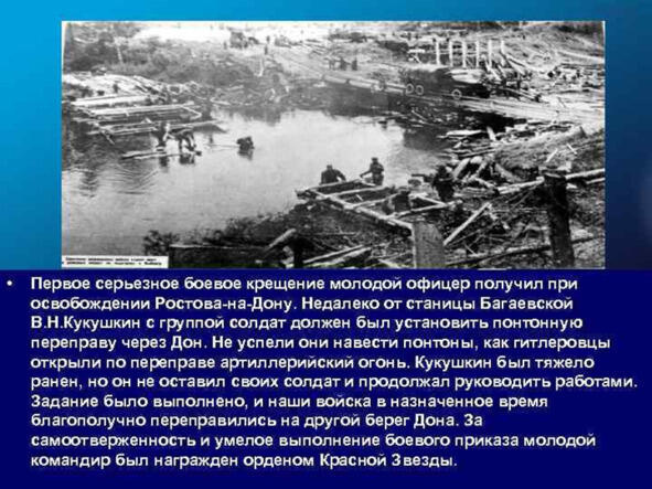 На четвёртый фронтовой день к мосту, который рота Лукошкина через Дон навела и трое суток под обстрелом ремонтировала, маршал Будённый С. М. прикатил. Командир полка, понятно, тоже прибежал. Видит маршал, кругом воронками берег изрыт, «младшой» раненный-контуженный шатается, а мост не шелохнётся! По нему тяжёлая артиллерия идёт, наступление развивать.