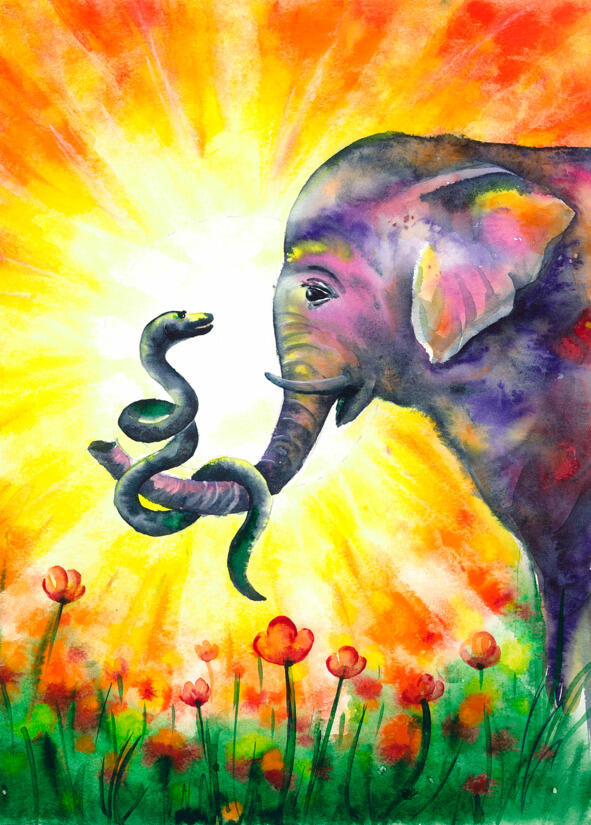 И вот однажды на её пути встретился Слон. Он заслонил собой не только солнце, но и всё небо. Мамбе стало невыносимо от такого посягательства на её пространство. И она начала свой танец. Изгибаясь кольцами, она быстро обвилась вокруг толстой ноги слона и безжалостно вонзилась в неё зубами.