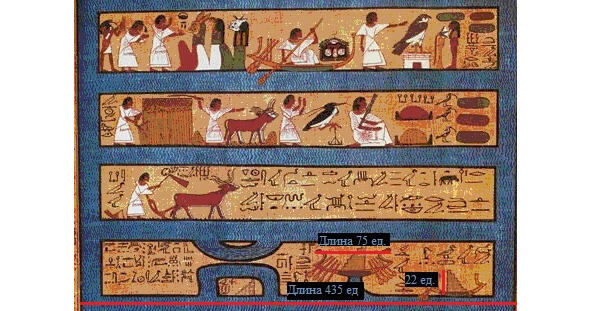 Рисунок 17. Соотношение длины «солнечной ладьи», высоты «зиккурата» и основания полей Иалу. Папирус Ани. Фрагмент. Британский музей. Википедия. Общественное достояние.