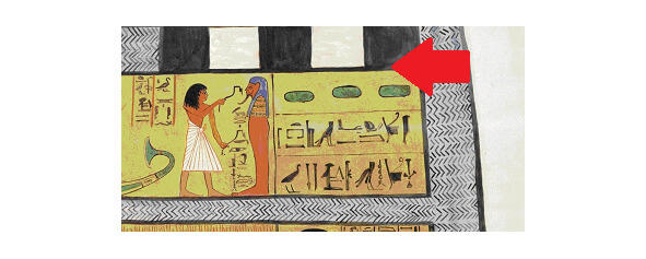Слои саркофага были покрыты различными символами, изображениями богинь с крыльями; между слоями находилось несколько видов оружия. Тело фараона было залито смолистыми веществами. Фантастически предположим, что древние додумались до способа «закидывать» космонавтов на орбиту (или далее) поштучно, не гоняя каждый раз крупные ракеты. Некое подтверждение этому мы можем увидеть на копии рисунка из Дейр-эль-Медины. Здесь можно увидеть, что в верхней части сооружения, прямо над саргофагоподобной фигуркой, имеются какие-то полосы. Может, это как раз места прибытия саркофагов.