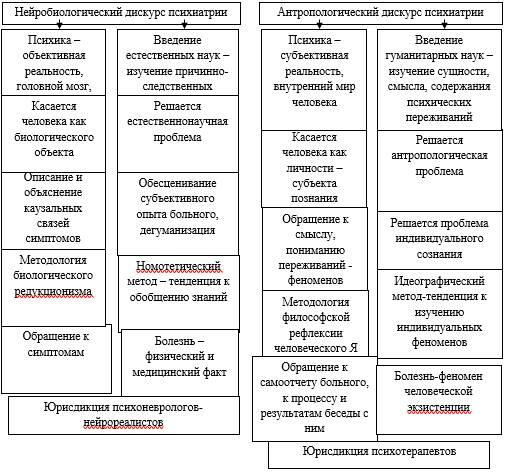 Из этого следует, что существуют серьезные противоречия между биомедицински-ориентированной психиатрией и ее антропоцентрическим направлением. Различные оттенки этих противоречий и двойственность предмета психиатрии (мыслительной схемы по К. Ясперсу) или «конкуренция» психиатрических дискурсов показана на рис. 1.