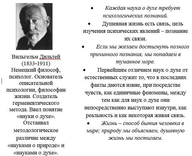Понимание считается специфическим методом наук о духе, интуитивным постижением (реконструкции) духовной целостности личности, ее индивидуального психического опыта «живого опыта», представляющего собой непосредственное выражение внутренней духовной жизни человека, основу человеческого духа. Как операция мышления понимание связано с усвоением содержания переживаний пациента путем его включения в систему устоявшихся идей и представлений исследователя.