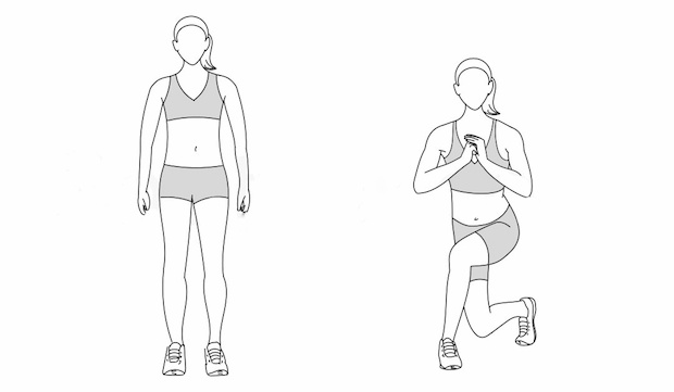 Исх. положение: стоя, стопы на ширине плеч, спина прямая. Руки можно сложить в замок у груди либо положить на пояс. Делаем выпады- шаг назад по диагонали, коленом мягко касаемся пола. Обрати внимание, что колено ноги, которая остается спереди, не заходит за носок и образует прямой угол. Работать можно произвольно: можно выполнить сначала все 30 раз на одну ногу, затем поменять их, а можно менять стороны с каждым разом.