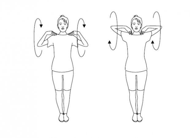 Вращение плечами: круговые движения вперед и назад, максимально возможная амплитуда (это важно), по 12 кругов вперед и 12 кругов назад