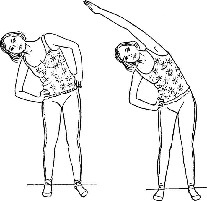 Наклоны в стороны. Исх. положение: стоя, ноги на ширине бедер. С выдохом поочередно наклоняемся влево и направо. Отслеживаем ощущения. По 12 наклонов в каждую сторону.