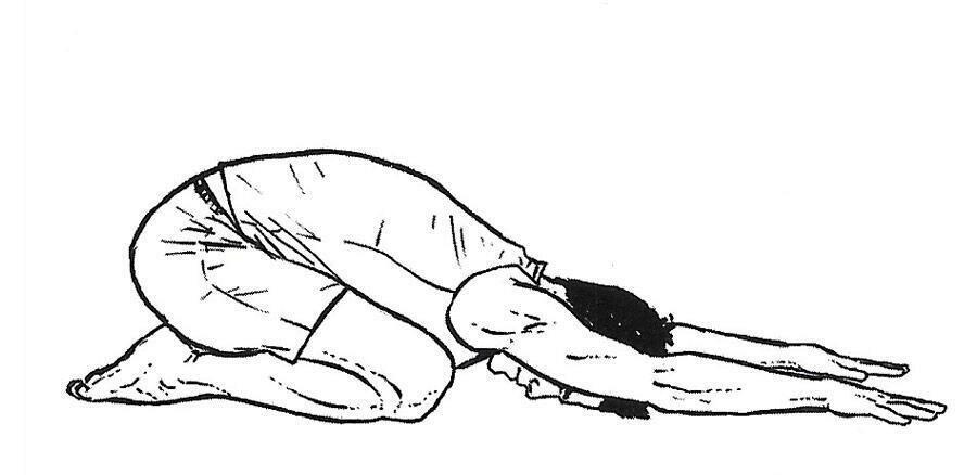 Садимся тазом на пятки, животом ложимся на бедра, руки вытянуты, опора- на ладони. Лоб лежит на коврике. Если не получается опустить таз на пятки, то под него можно положить свернутый плед или валик. Если лоб далеко не на полу, то можно согнуть руки и положить его на руки. Отдых в этом положении 2 минуты.