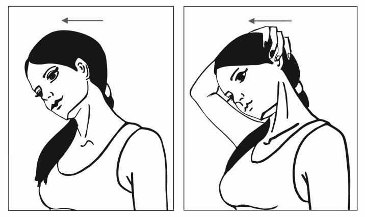 Исх. положение: сидя с прямой спиной или сидя. Макушкой тянемся вверх, плечи опускаем вниз. Размещаем ладонь правой руки на левое ухо, наклоняем голову к правому плечу. Ладонью слегка усиливаем наклон. Задерживаемся на 20 секунд, затем меняем стороны. Никуда не поворачивай подбородок!