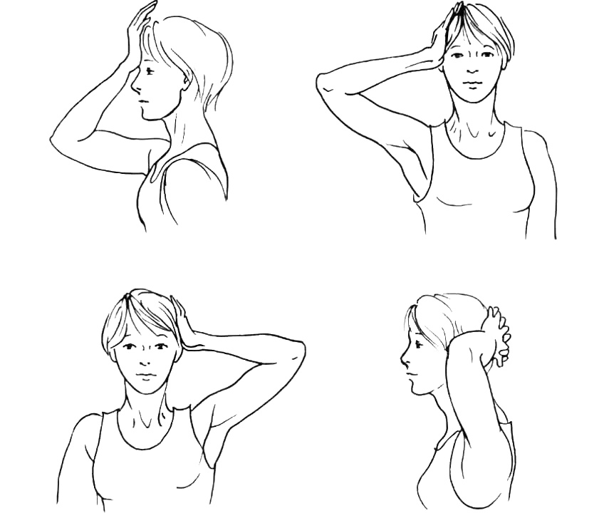 Сцепите руки в замок, расположите их на затылке, разведите локти в стороны. Оказывая сопротивление, давим руками на затылок, а затылком- на руки. Задерживаемся на 3-5 секунд, 6 раз.