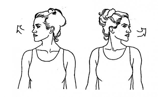 Держа голову прямо, не запрокидывая назад и не наклоняя вперед, поворачиваем ее направо и налево, как бы стараясь заглянуть за плечо