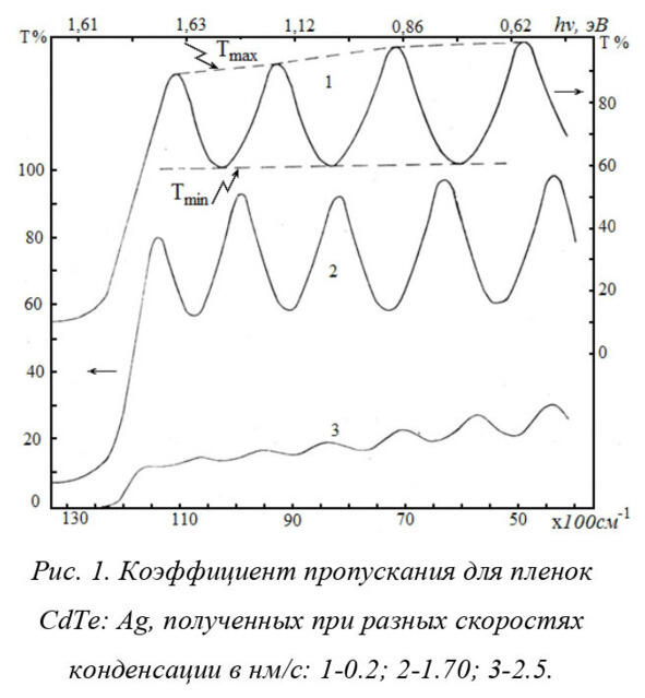 Из рисунка видно, что в длинноволновой области спектра в пленках наблюдается интерференция. Для пленок, полученных со скоростью конденсации 0.2 и 1.73 нм/c в области спектра hν = 0.51.0 эВ, Tmax достигает 9097%. При скоростях конденсации 2.5 нм/с Tmax и Tmin интерференции уменьшаются (кривая 3) и Tmax достигает 30% в длинноволновой области спектра. В пленках, полученных при сравнительно больших скоростях 2,53 нм/с, интерференция наблюдается только в области 22.5 мкм, а Tmax в этой области достигал 20%. Отсюда следует, что с увеличением скорости конденсации коэффициент пропускания уменьшается.