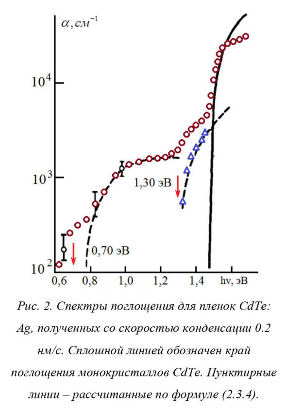 Кроме того, толщина пленок определялась с помощью микроинтерферометров МИИ 4 и МИИ 9 посредством смещения интерференционных полос, возникающих при отражении света от поверхности слоя и подложки. Величина d, вычисленная по формуле (2.5.10) совпадает по погрешности с измеренной на МИИ 4 и МИИ 9. Затем, зная значения n, d, мы определяли коэффициент поглощения () c помощью формулы (2.5.8) и представили их зависимости от hν на рис. 2. Как видно, в спектрах поглощения света в этих пленках имеется явно выраженная примесная полоса поглощения. В области (1.461.5) эВ поглощение света почти совпадает с данными для монокристаллов (имеется длинноволновый сдвиг около 0.02 эВ) и соответствует собственной полосе поглощения. Длинноволновый сдвиг может быть объяснен внутренним механическим напряжением в пленке 2.5·108 Па, если использовать для барического коэффициента изменения ширины запрещенной зоны значение эВ· см2/кГ [24]. Далее имеется одна более явно выраженная полоса с красной границей около 1.3 эВ и другая, не подающаяся надежной расшифровке, в которой коэффициент поглощения уменьшается от порядка 103 до 102см-1 в области 0.71.3 эВ (рис.2). Обе эти полосы связаны с поглощением света глубокими центрами.