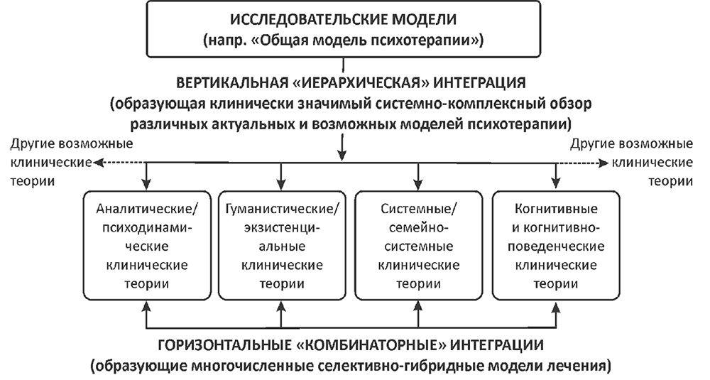 Существует несколько попыток систематизировать и классифицировать интегративное движение в психотерапии. Орлинский (Orlinsky, 2009) описывает две модели теоретической интеграции (см. рис. 1). Первая (вертикальная) собственно Общая модель психотерапии, которая базируется на результатах исследования, позволяющих видеть общее для каждого направления. Вторая (горизонтальная) фокусируется на возможностях совмещения различных модальностей.