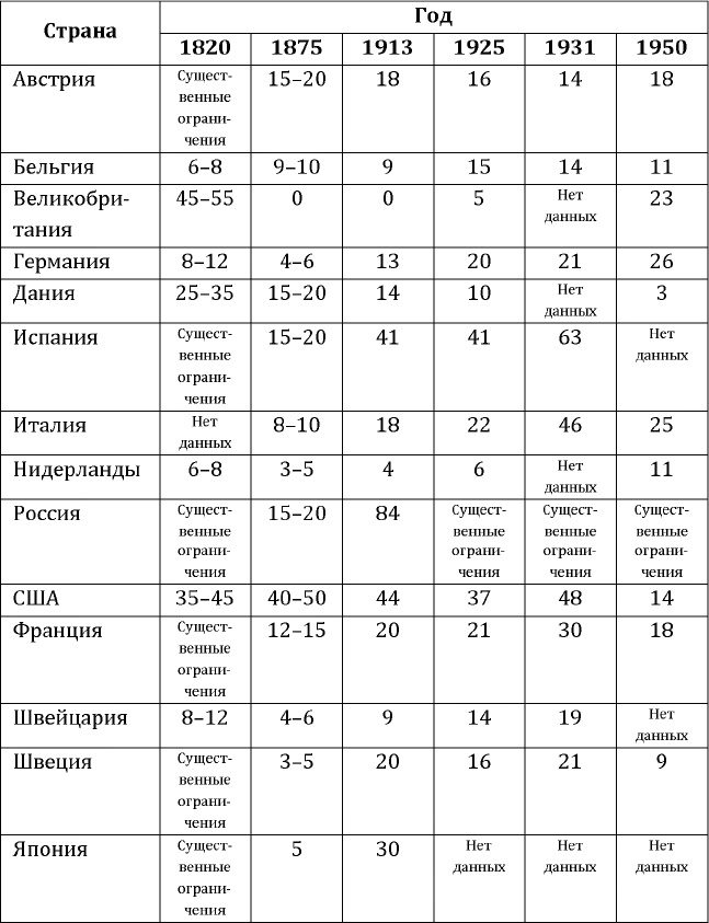 Таблица 1. Средние ставки таможенных тарифов на промышленные товары для выбранных стран на их ранних стадиях развития (в процентах от стоимости)