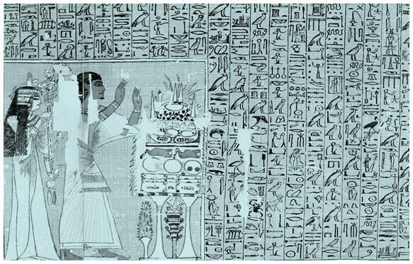 Писец Ани, воздев руки в позе адорации, стоит перед жертвенным столом с приношениями, состоящими из бычьих ног и жертвенных пирогов, сосудов с вином и маслом, фруктов, цветов лотоса и других цветов. На нем бело-шафрановые одежды, на голове парик, на шее ожерелье, руки унизаны браслетами. Позади Ани стоит его жена «Осирис госпожа дома, певица Амона Туту»[29]; облаченная подобно мужу, она держит систр и виноградную (?) лозу в правой руке и ожерелье менат в левой.