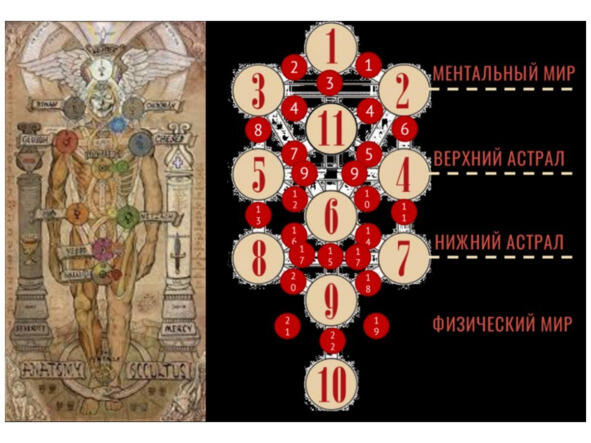 Древо Сефирот или Древо Жизни это устройство нашего мира. И по нему разложились полностью наши арканы (изображены в виде номеров в красных кружочках). А справа от 1 до 11 расшифровка тонких миров внутри нашего Древа. 11 центр редко изображается. Старшие арканы лежат на путях между тонкими мирами. Они являются показателями действий, которые надо совершить, чтобы попасть из одного в другой. Например, чтобы от Власти перейти к Мудрости, нужно стать Магом, взять себя в руки и начать развиваться. Чтобы разобраться, как поступить в определенной жизненной ситуации, вам надо понять, через какой путь идти. Если вы умеете делать, как каждый старший аркан, проживать ситуации так, как каждый предписывает, то в жизни вы способны на все.