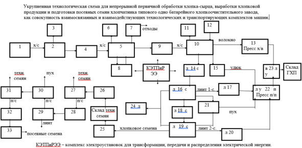 Ниже на рис. I.1. приведена укрупненная технологическая схема для непрерывной первичной обработки хлопка-сырца, выработки хлопковой продукции и подготовки посевных семян хлопчатника типового однобатарейного хлопкоочистительного завода как совокупность взаимосвязанных и взаимодействующих технологических и транспортирующих комплектов машин.
