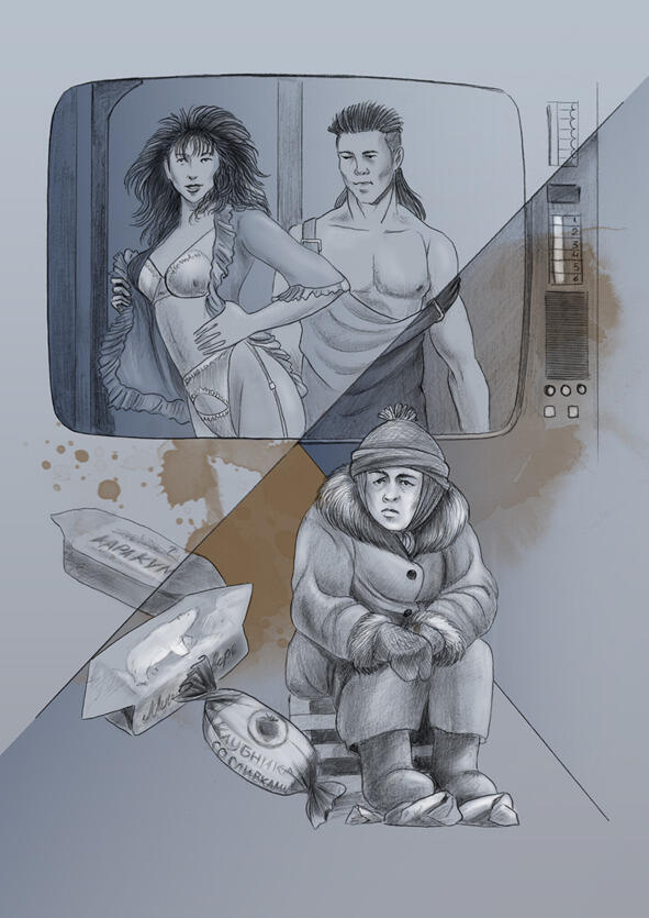Диса приходит к нам домой и сидит в кухне, пока мама меряет ему парик. Он даже куртки не снимает. Сидит, как на вокзале, полностью одетый. Куртка у него кожаная, с меховым воротником, на вид очень тяжёлая и тёплая. Пару раз вместе с ним приходила одна молодая женщина, он называл её Киска, а как на самом деле зовут не знаю. Папа говорит, что она выглядит, как «прости господи». А по-моему, как иностранная певица. Киска очень модная. В короткой кожаной мини-юбке, колготках в сеточку, сапогах до колена на тонких высоких каблуках, а сверху у неё меховая шубка, которую она тоже не снимает в помещении. Она очень ярко накрашена, а на голове у неё золотистые мелкие кудряшки. От неё сильно пахнет сладкими духами, и она постоянно курит. Даже не спрашивает мою маму, можно ли курить у нас на кухне! Потом приходится проветривать квартиру, но в воздухе ещё долго держится запах духов и сигаретного дыма.