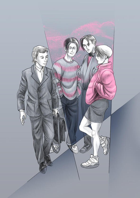 Скоро почти весь класс был одет и подстрижен, как наш тьютор Евгений Евгеньевич. Я боялась, он рассердится, что мы слизали его стиль, но он совсем не сердился. В понедельник, когда английский был первым уроком и мы уже все сидели в классе, открылась дверь, и вбежал мой одноклассник Андрюха, он опоздал. И мы все увидели, что у него теперь тоже была стрижка каре-баттерфляй. Ещё один подстригся! Он стал извиняться за опоздание: