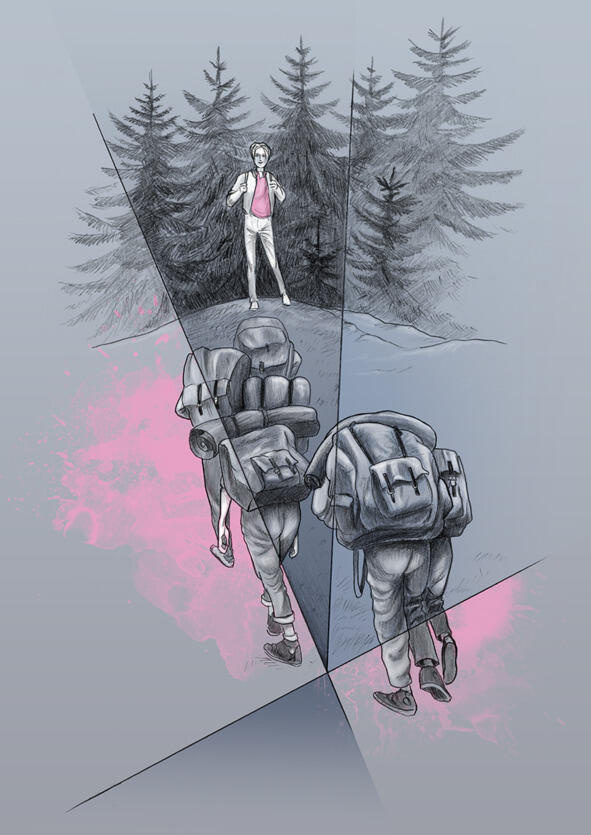 Мы шли и шли, шли и шли. Лес, кажется, и не собирался кончаться. У Евгения Евгеньевича был с собой компас, и он уверял, что мы не заблудимся. Мы все очень устали, но наш классный руководитель не устал ни капли, он бодро и весело шагал вперёд, пел всякие английские песни, и мы подпевали, несмотря на усталость. Но ведь в походах всегда так, нужно преодолевать трудности, нести тяжёлый рюкзак и не ныть, правда же?