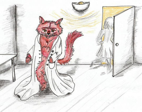 На подлёте к лаборатории «Блудливых туманов и Живительных рос» коллеги услышали женские визги, звуки сражения и приторно-язвительные мурлыки. Влетев в распахнутую дверь, и утонув по колено в клубящихся серых нитях, они увидели Кота ростом с телёнка, восседающего в белом лабораторном халате на огромном пне.