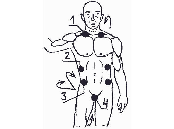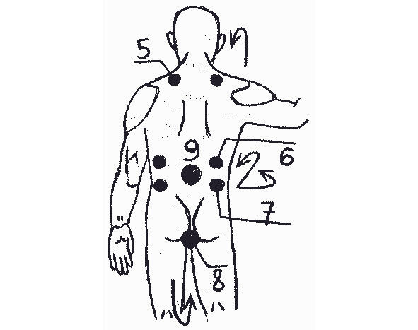рисунок 6- Цели для рубящих ударов: 1- ключица (сверху); 2- нижние ребра (сбоку); 3- тазовая кость (сбоку); 4- пах (снизу); 5- плечевое сплетение (сверху); 6- ребра (сбоку); 7- почки (сбоку); 9- поясница (сбоку).