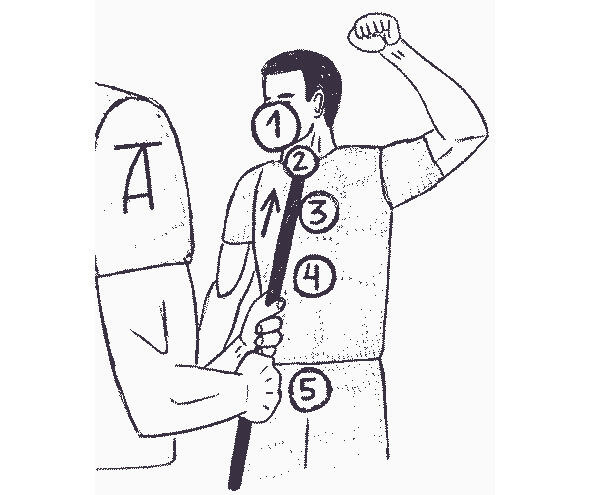 рисунок 5- Цели для тычковых ударов спереди: 1- лицо; 2- шея спереди; 3- грудина; 4- солнечное сплетение; 5- низ живота (область лобка).