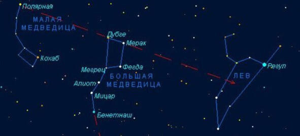 На рисунке наглядно отображено то, о чем говориться в этом фрагменте: проекция линии, соединяющей две звезды Дубге и Мерак (Пулаха и Крату) созвездия Большой медведицы (Саптариши) на созвездие Льва.