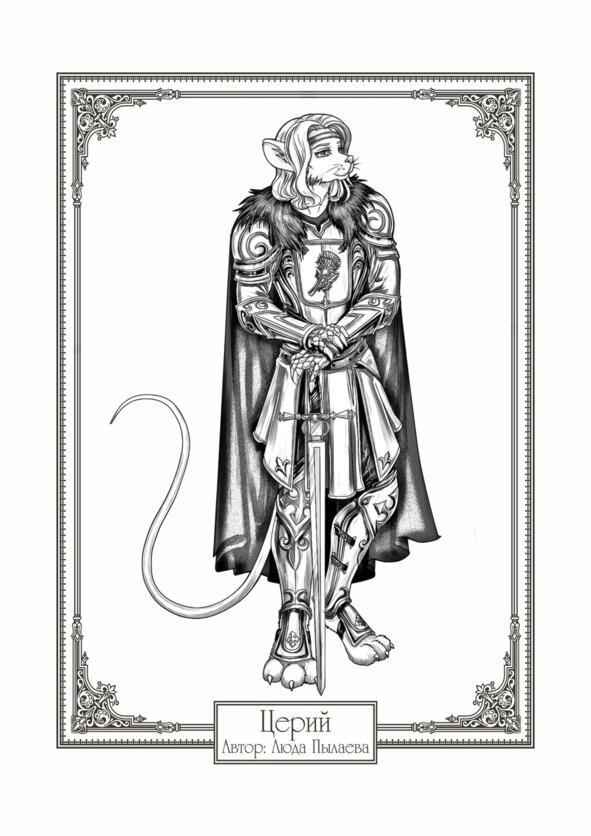 По правую руку рядом с ним следовал невысокий мышь в летах, темно-серого окраса с голубым отливом, одетый куда проще рыцаря в обычную одежку оруженосца, состоявшую из простой льняной рубахи, доходившей до колен и просторных штанов. Рубаха подпоясывалась кожаным ремнем, поверх которой одевался стеганный жилет на шнуровках по обеим бокам.