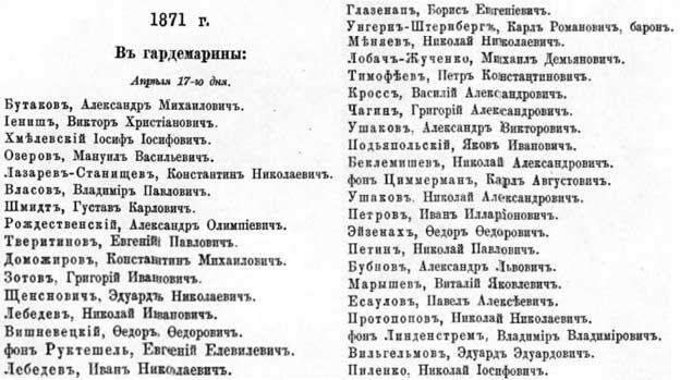 Я попытался сопоставить факты достижения адмиральского звания, степень вклада в развитие военно-морского дела и науки с успеваемостью в МКК 17 морских офицеров. Для этого я спросил у заместителя директора ЦГАВМФ А. Ю. Емелина, имеются ли данные об учебных успехах выпускников МКК 1871 г. Алексей Юрьевич любезно прислал мне эту информацию из книги «Обзор преобразований Морского Кадетского корпуса с 1852 года с приложением списка выпускных воспитанников 17531896 г. (СПб., 1897)». Список питомцев корпуса, ранжированный по успеваемости за 4 года учебы, перед вами.