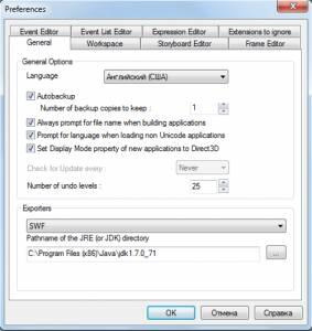 Во вкладке General основные настройки для нас важно меню выбора языка (требуется перезапуск) и нижнее меню General настройки экспортёров. В первом его пункте, General, нам необходимо установить и указать путь к директории JDK (скачать можно по ссылке www.oracle.com/technetwork/java/javase/downloads/), а также Android SDK (developer.android.com/intl/ru/sdk/index.html).