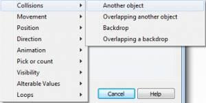Создадим новый объект землю для нашего героя. Как и в прошлом уроке, мы можем создать её из вкладки Background Backdrop, но можно использовать в качестве земли и активный объект. Тогда наше условие соприкосновения (предотвращение падения объекта) будет выглядеть так (Collision Another object):