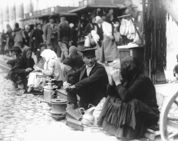Украинский город Сумы оказался под властью большевиков в конце 1919 года, но в центральном регионе такая ситуация сохранялась еще с 1918 года. Еще до ноябрьского декрета о муниципализации регулярная торговая сеть сократилась до такой степени, что для советских чиновников символом капитализма стали базары, а не магазины. Большевистская риторика делала символами неформальной и формальной сторон экономики времен Гражданской войны две московские достопримечательности: Сухаревку, самый известный столичный базар, и Красную площадь, где располагалось советское продовольственное управление[41]. От наблюдателей того времени до нас дошли многочисленные описания Сухаревки, которую историк, писатель и мемуарист Ю. В. Готье называл одним «из двух великих проявлений русской революции» (наряду с Лениным!) [Готье 1997:321][42]. Каждый день, особенно по выходным, мужчины и женщины толпились на улицах и в переулках вокруг Сухаревской площади со своими сумками, сумочками, а зимой и с санями. Сидя на тротуарах и толпясь у входа на рынок, некогда зажиточные горожане предлагали покупателям ношеную одежду или протягивали серебряными щипцами кусочки сахара (рис. 1). Внутри рынок представлял собой ряды прилавков, с которых более крупные и организованные торговцы продавали продукты, предметы домашнего обихода, ткани и книги. Между ними, втиснувшись во все свободные места, мелкие лавочники ставили свои тележки, старухи стояли с корзинами капусты, а другие просто раскладывали свой товар на земле. В другом отделе сгрудились кафе, торгующие различными видами уличной еды. Весной 1919 года на Сухаревку приходилось до половины всего торгового оборота Москвы. Как отмечал один современник, это было единственное место в столице, где продавались товары «из киосков и ларьков, с весами, оберточной бумагой и всеми атрибутами нормальной торговли»[43].