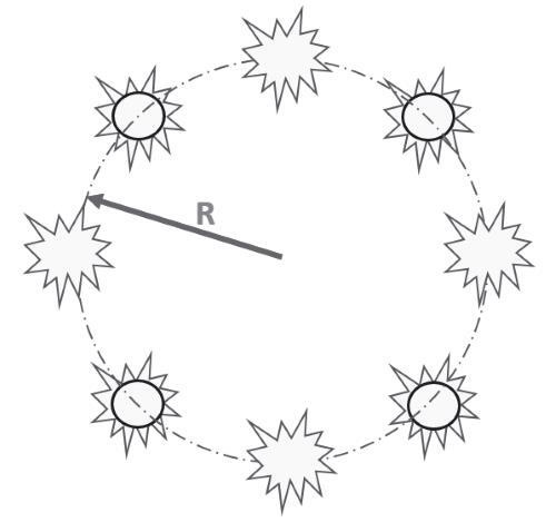 Возьмём 4 звезды массой М, расположим их в вершинах квадрата, вписанного в орбиту радиуса R.