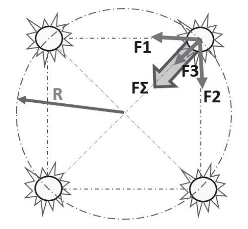 Когда центробежная сила будет равна сумме сил F1, F2, F3, стабильность вращения галактики будет обеспечена.