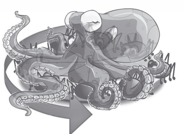 3. Так почему же на таких скоростях галактика в реальности не рассыпается? И вот задумалась тётя Вера (Вера Рубин и прочие космологи) и по своей недалёкости или из-за любви к сказкам решила, что должна быть ещё какая-то «тёмная масса», которая гравитационно удерживает всю эту конструкцию (см. рис. 3, показана в виде тёмного осьминога).