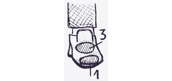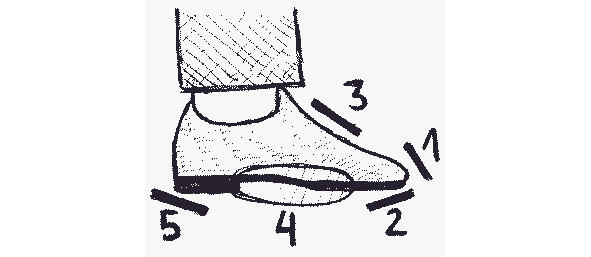 рисунок 7 (2) Ударные сегменты обутой стопы: 1- носок; 2- передняя часть подошвы; 3- область язычка и шнуровки; 4- вся область подошвы; 5- область пятки.