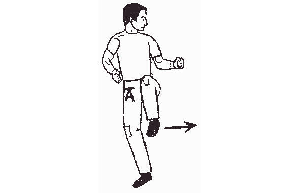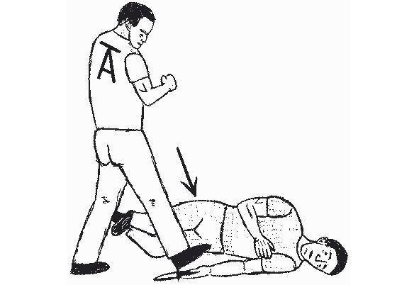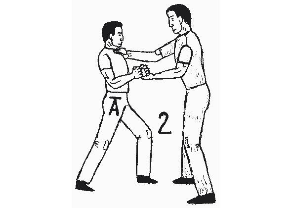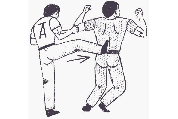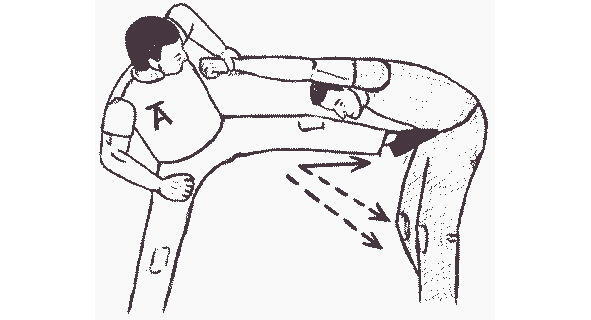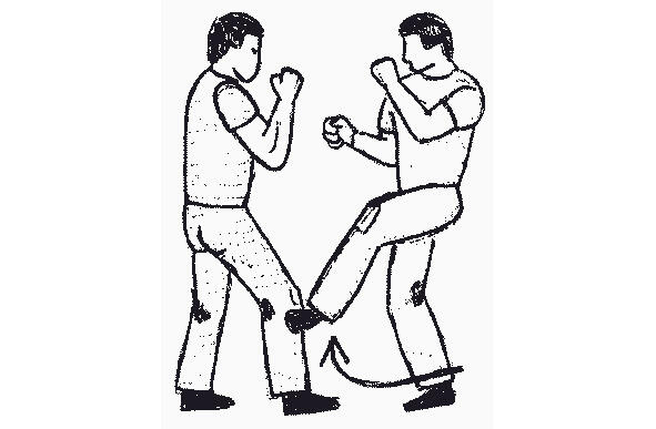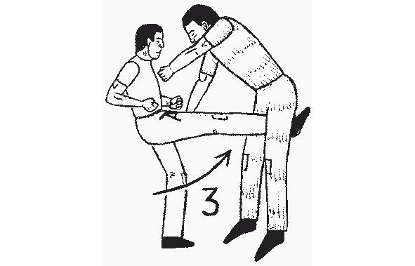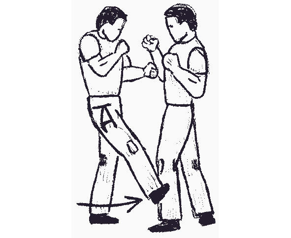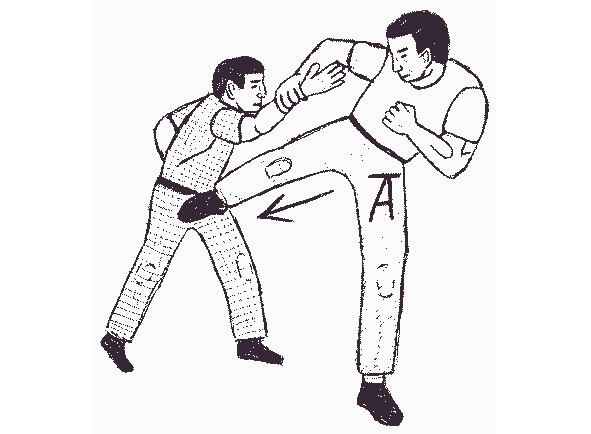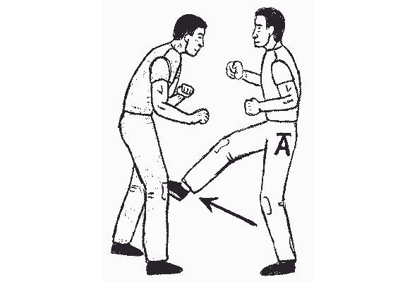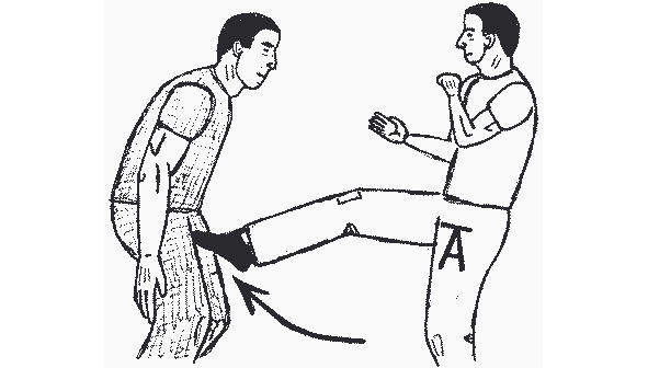В приведенном на рисунке 13 примере, при повороте лицом к противнику, защищающийся оказывается в удобной для нанесения удара ногой стойке. Затем он выбрасывает ступню вперед в удар, целясь между ног нападающего. Область контакта 25 сантиметров от подъема ступни до голеностопа довольно велика, чтобы обеспечить глубокое проникновение. Если целиться в пах только носком, то больше шансов промахнуться (а).