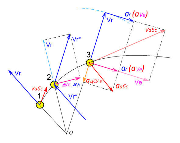 В результате, в конце цикла относительная скорость точки на радиусе и тела в переносном направлении становится равной нулю, а скорость относительного движения поворотного движения направлена строго вдоль радиуса. На этом полный цикл формирования поворотного движения и ускорения Кориолиса заканчивается (см. Рис. 4.1.2.1, поз. 3), после чего начинается новый абсолютно идентичный предыдущему цикл поворотного движения. Разумеется, всё это происходит на микроуровне.