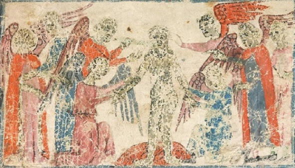По всей видимости, изображено творение человека в соответствии с трёхчастной антропологией эллинистической эпохи. Данная антропология была усвоена иудеями и приспособлена к их собственной религиозной традиции, о чём свидетельствует, например, Иосиф Флавий: «Бог сотворил человека, взяв для этого прах от земли и соединив с ним дух и душу» (πλασεν θες τν νθρωπον χον π τς γς λαβών, κα πνεμα νκεν ατ κα ψυχήν) (Иудейские древности, 1, 34). Три фигуры с крыльями представляют богов («ангелов»), творящих тело, душу и дух Адама. Остаётся неясным, кого представляет четвёртая фигура без крыльев (самого Яхве?).