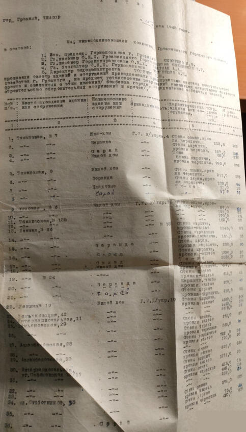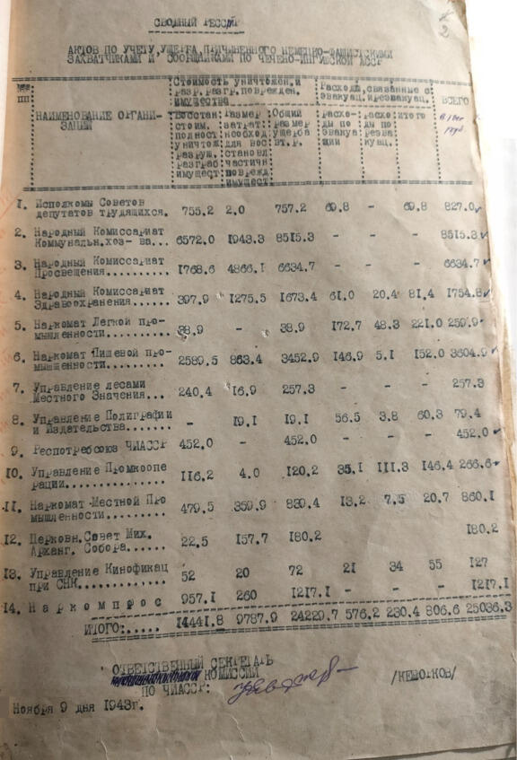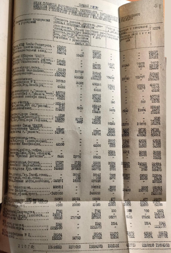 Реестры актов, обобщенные сведения и акты по учету ущерба, причиненного немецко-фашистскими захватчиками и их сообщниками предприятиям и организациям Управления Делами СНК ЧИАССР, Коммунальному хозяйству, Легкой промышленности, Пищевой промышленности, Управление Лесами местного значения, Управление издательства и полиграфии, Местной промышленности, народному образованию, Здравохранению, потребсоюзу и промкооперации, Заготовительному Управлению Горфинотделу Чечено-Ингушской АССР. /Грозненской области/. Начато: 20.10.1942 г.; Окончено: 15.11.1943 г. На 235 листах.