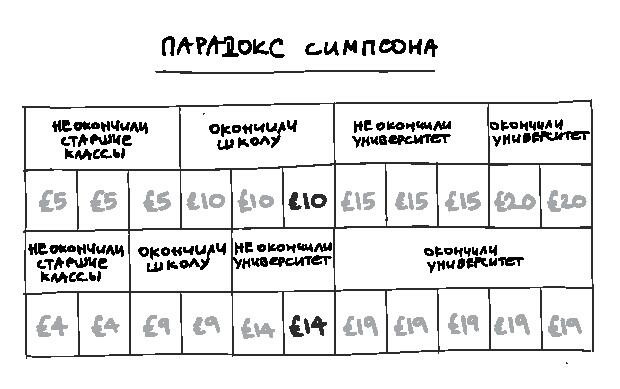 Такое происходит на удивление часто. Например, чернокожие американцы курят чаще, чем белые, но если разбить их на группы по уровню образования, то оказывается, что в каждой из них чернокожие курят реже. А все потому, что среди более образованных граждан, где процент курящих меньше, ниже доля чернокожих.